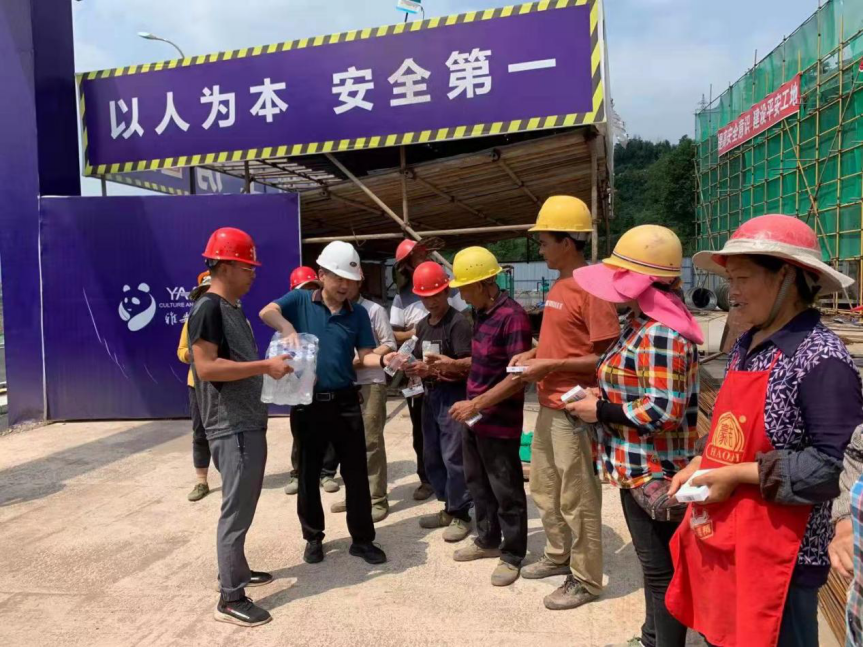 在熊貓高地和皇茶項(xiàng)目,王躍分別向戶外高溫作業(yè)下的現(xiàn)場(chǎng)施工人員及管理人員派發(fā)藿香正氣液、礦泉水等防暑降溫物資,把清涼送到了生產(chǎn)一線,把關(guān)懷送到了員工心坎。他首先感謝大家克服高溫炎熱、盡職盡責(zé)的工作,并叮囑大家在保證安全生產(chǎn)的同時(shí),一定要注意做好防暑降溫工作,避免中暑,將自己身體健康放在首位,為公司發(fā)展再建新功。