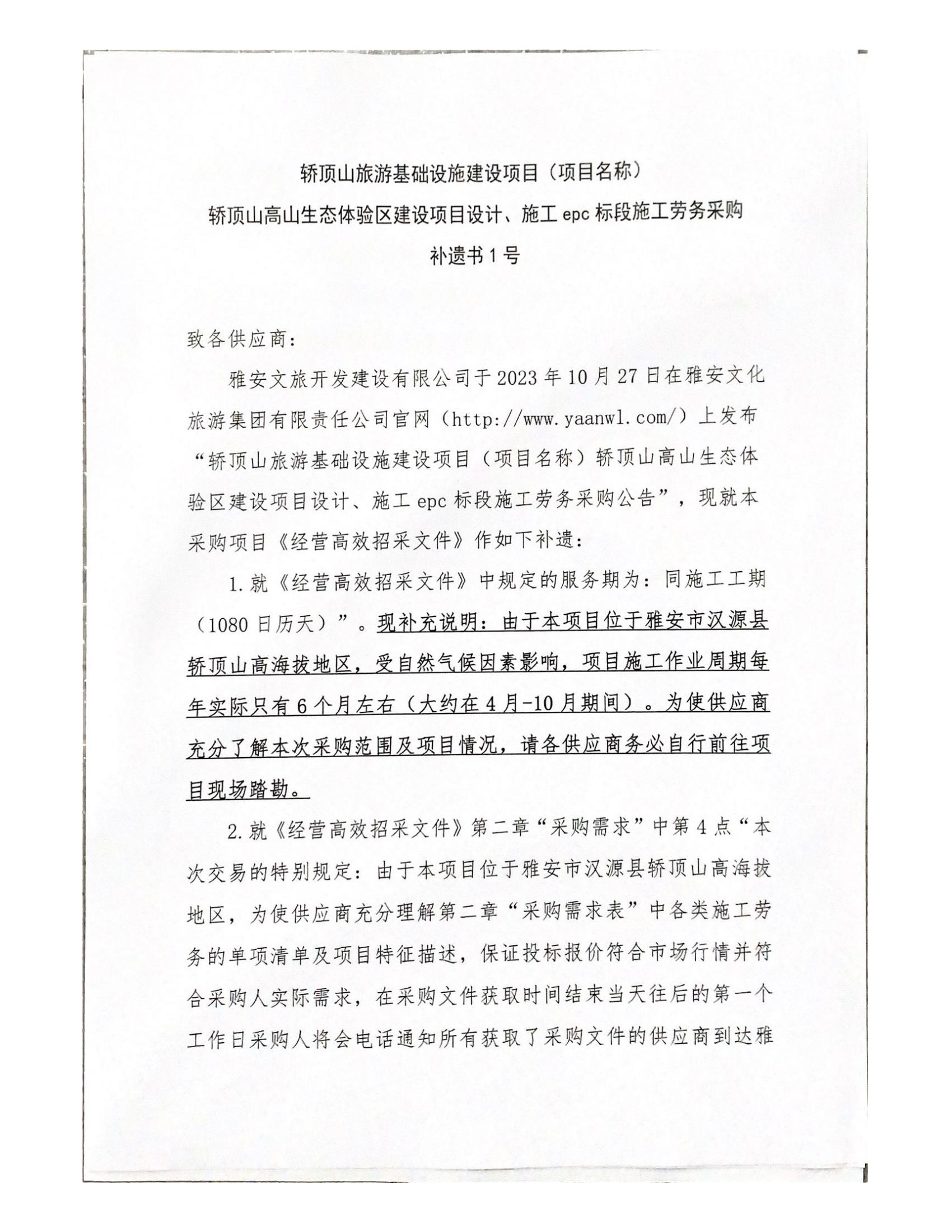 轎頂山旅游基礎(chǔ)設(shè)施建設(shè)項(xiàng)目《項(xiàng)目名稱)轎頂山高山生態(tài)體驗(yàn)區(qū)建設(shè)項(xiàng)目設(shè)計(jì)、施工 epc 標(biāo)段施工勞務(wù)采購(gòu) 補(bǔ)遺書1號(hào)