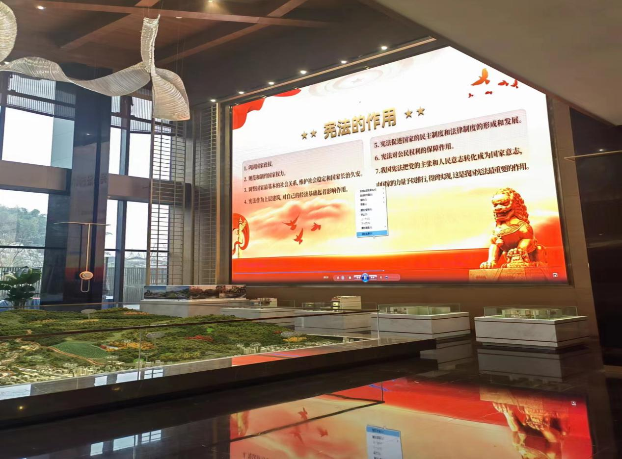 三是定點(diǎn)投放憲法宣傳標(biāo)語(yǔ)。為加強(qiáng)憲法宣傳,提高公民的法律意識(shí),同時(shí)起到時(shí)刻提醒公民關(guān)注憲法、了解憲法的作用,雅安文旅集團(tuán)通過(guò)酒店大屏、建設(shè)工地、房產(chǎn)銷售中心等多處電子宣傳屏投放憲法宣傳標(biāo)語(yǔ),以此營(yíng)造良好的憲法宣傳氛圍,增強(qiáng)了憲法學(xué)習(xí)宣傳聲勢(shì),形成了規(guī)模效應(yīng)。