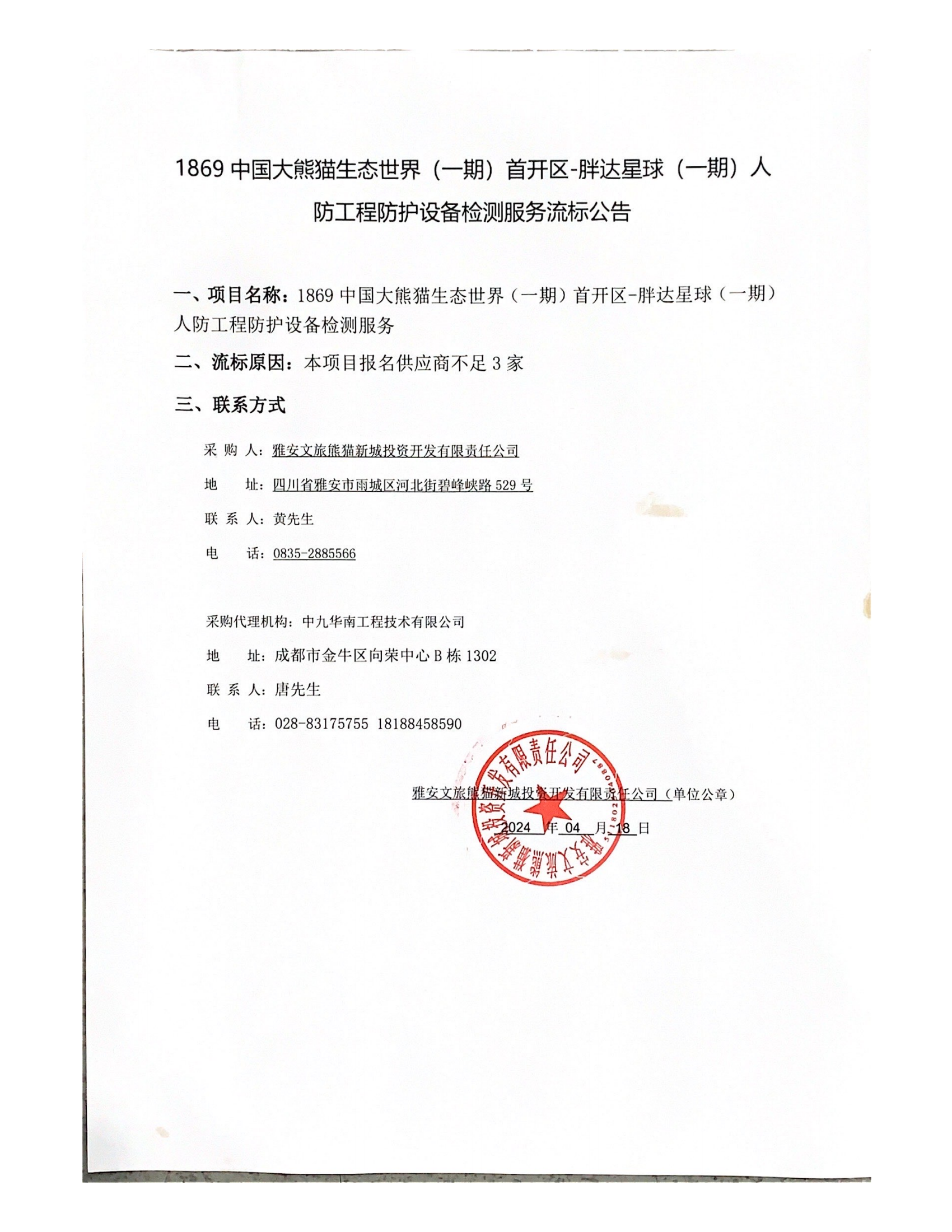1869 中國大熊貓生態(tài)世界 (一期) 首開區(qū)-胖達(dá)星球 (一期)人防工程防護(hù)設(shè)備檢測(cè)服務(wù)流標(biāo)公告