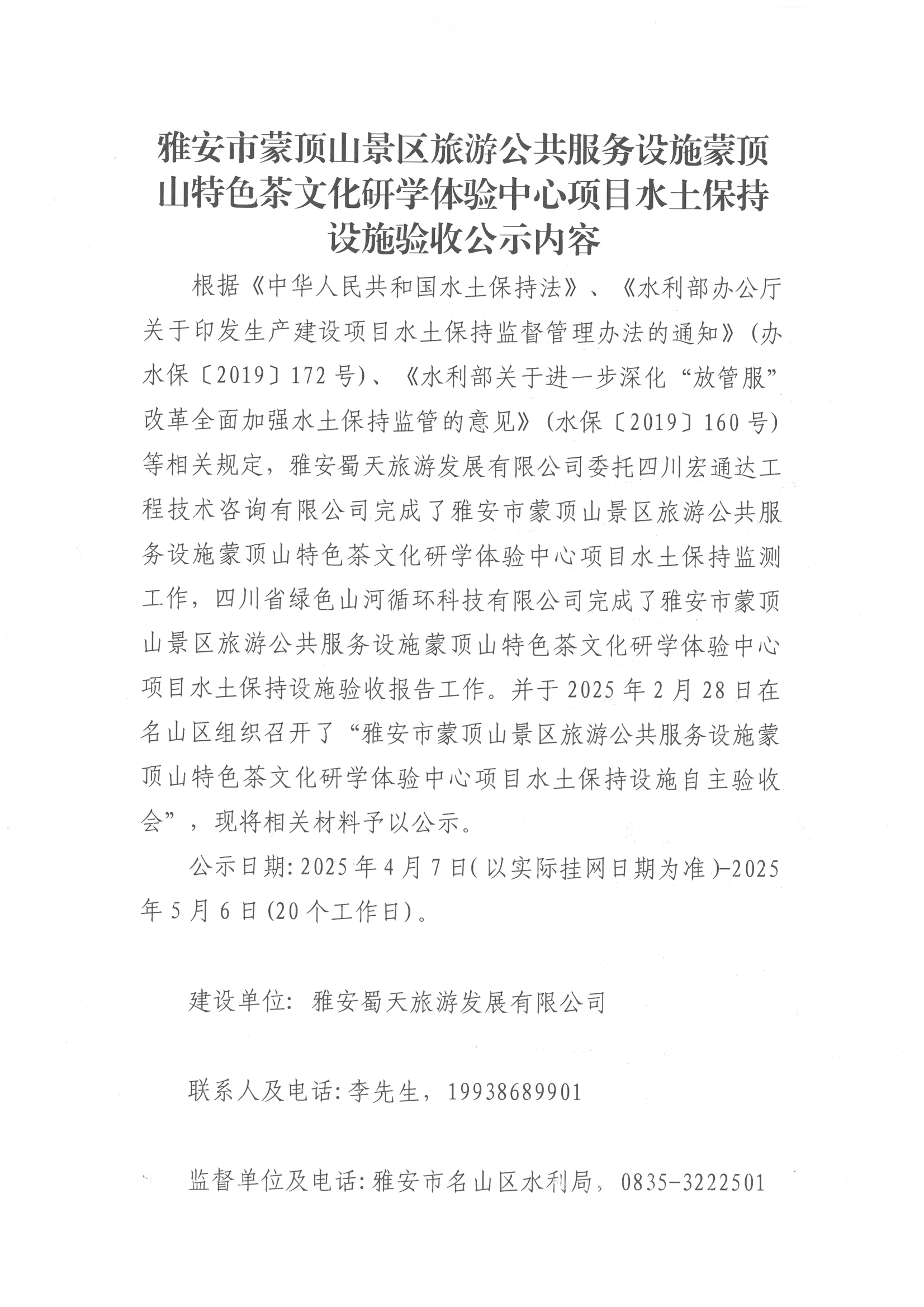 雅安市蒙頂山景區(qū)旅游公共服務(wù)設(shè)施蒙頂山特色茶文化研學體驗中心項目水土保持設(shè)施驗收公示內(nèi)容