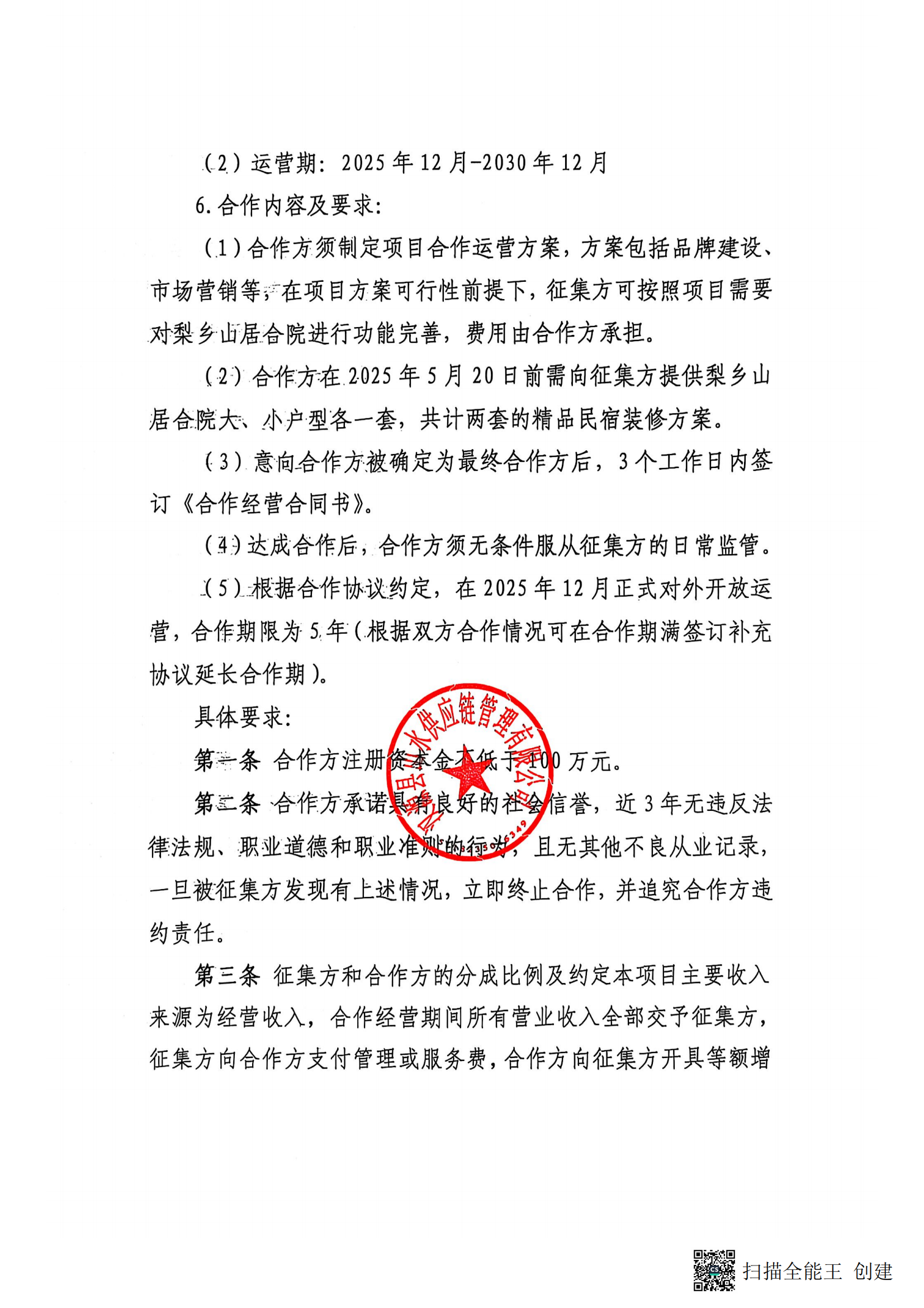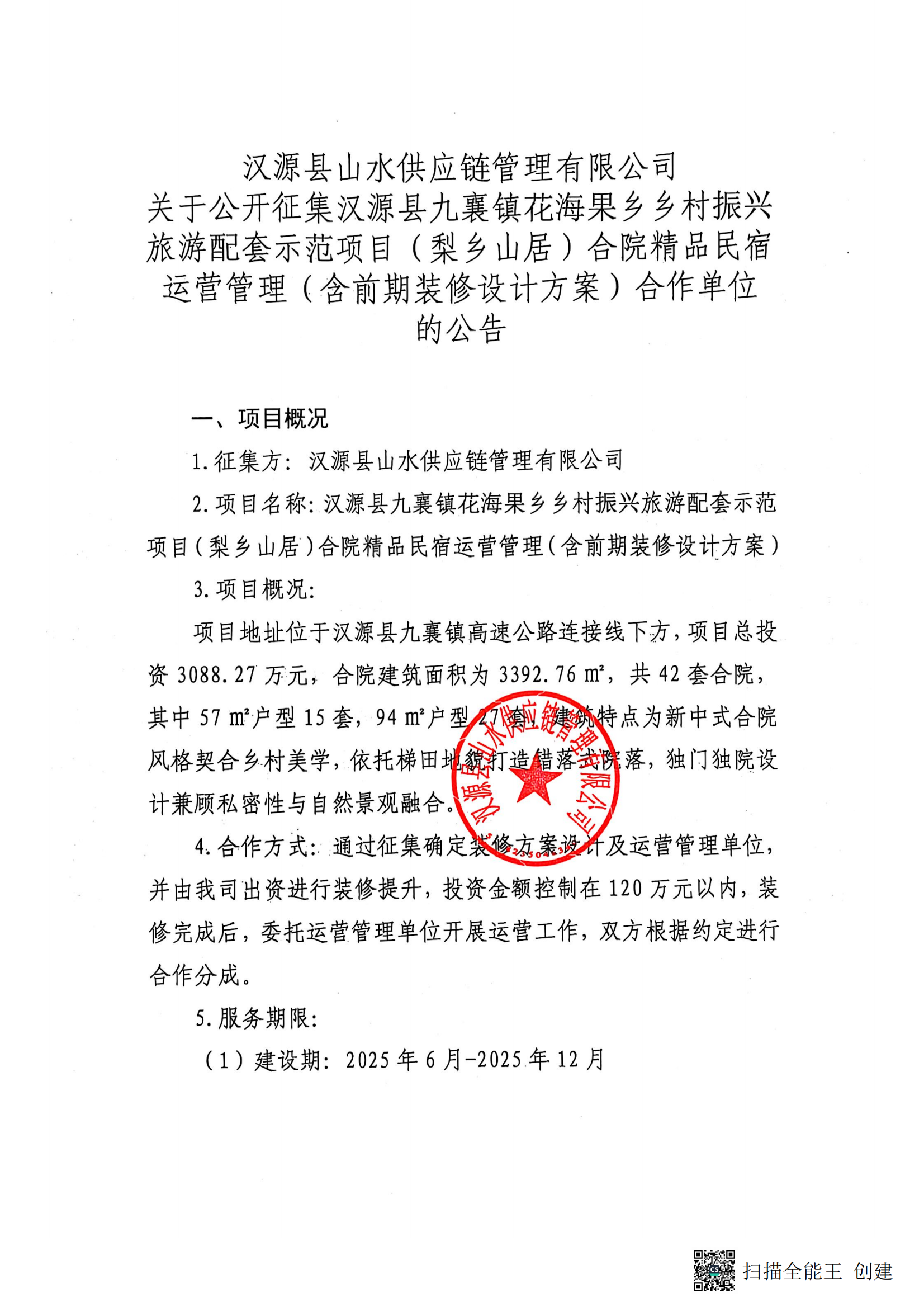 漢源縣山水供應(yīng)鏈管理有限公司關(guān)于公開征集漢源縣九襄鎮(zhèn)花海果鄉(xiāng)鄉(xiāng)村振興旅游配套示范項目(梨鄉(xiāng)山居)合院精品民宿運營管理(含前期裝修設(shè)計方案)合作單位 的公告